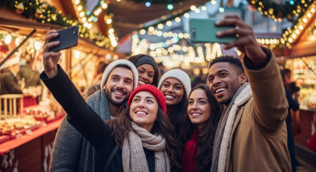 A cheerful group of diverse friends taking a selfie at a Christmas market, filled with twinkling lights, perfect for illustrating holiday joy and togetherness.