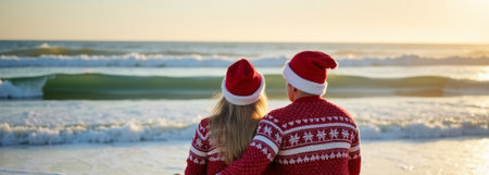 Romantic couple in Christmas sweaters and Santa hats sitting on a beach, watching ocean sunset, celebrating holidays in warm seaside destination. Travel to the sea banner