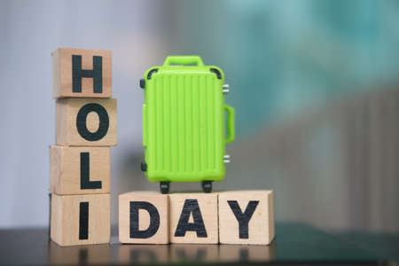 Green luggage suitcase on wooden block text of holiday. The concept of off on holiday