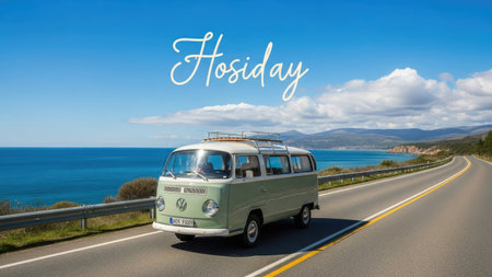 A classic vintage van travels along a coastal highway with the ocean visible in the background. The scene features a bright blue sky and sunlit conditions. The composition and colors suggest potential for travel, tourism, and lifestyle advertising, or for editorial use.