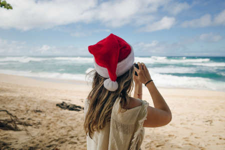 Young woman with smartphone in hat of Santa Claus resting sitting on beach in sun lounger. Christmas and New Year holidays, vacations, travel, tourism concept
