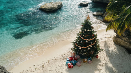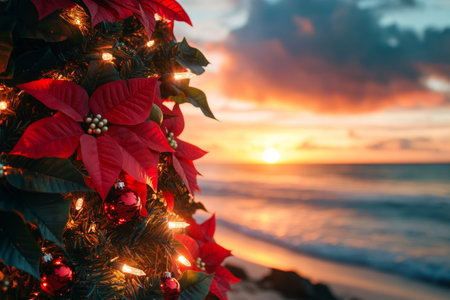 Tropical christmas tree adorned with poinsettias and ornaments on a serene ocean beach at dawn