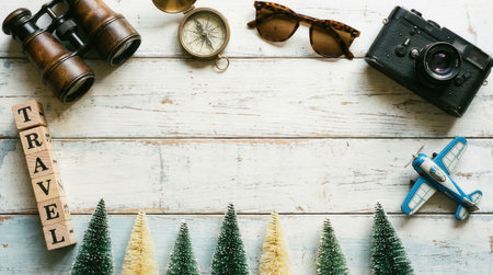 A collection of vintage travel items including binoculars, compass, sunglasses, camera, and toy airplane, alongside wooden blocks spelling TRAVEL and miniature trees, set against a wooden background.