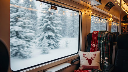 An interior shot reveals a train window framing a wintery forest. Inside, a seat with cushions and a blanket sits near the window, decorated with soft glowing lights. The scene suggests travel during a winter day. Suitable for illustrations related to travel, leisure, or design projects.