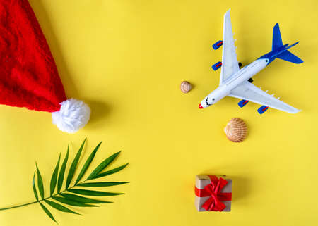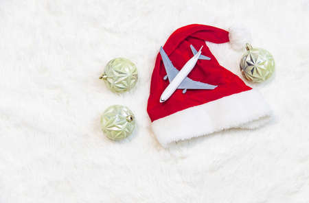 Christmas holiday travel background. Airplane with a passport and santa claus red hat