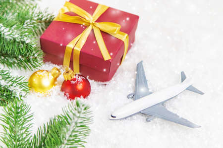Travel for Christmas. Airplane with Christmas decor. Selective focus.Holiday