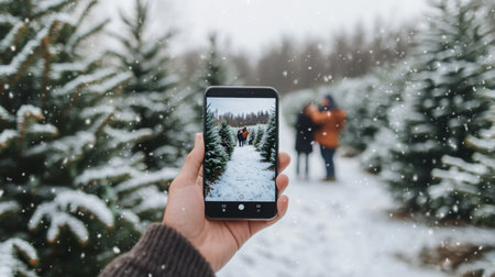 Capturing winter memories in a snowy Christmas tree farm during the holiday season