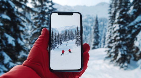 Capturing winter memories while skiing in the snowy mountains during a sunny day