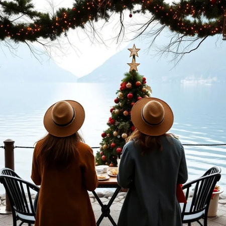 lake two girls in hats standing back Christmas holiday tree travel people. High quality photo