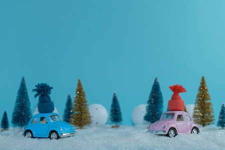 Blue and pink car in winter hats in a snowy forest. New year concept. Merry Christmas. Happy New Year.