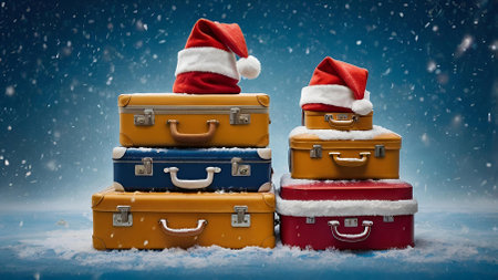 A stack of suitcases with a red Santa Claus hat on a blue background with snow. The concept of traveling on Christmas and New Year's Eve.