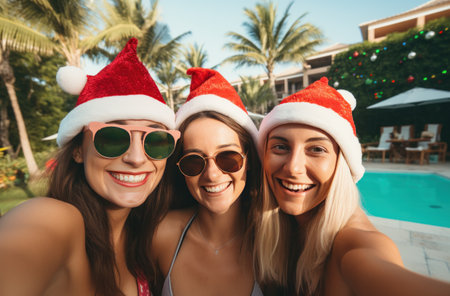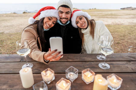 Three mixed race friends with lowered mask sitting on a wooden table outdoor in sea resort celebrating Christmas and New Year event making selfie with wine glasses - Smiling women posing in Santa hat