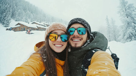 A smiling couple takes a fun selfie on a skiing adventure amidst a snowy mountain backdrop, showcasing their vibrant sunglasses and happy spirits on a winter day.