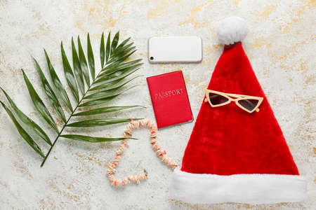Composition with Santa Claus hat, passport, mobile phone and sunglasses on light background
