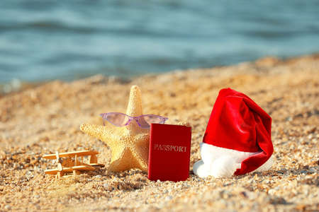 Santa hat, passport, starfish and gift on beach sand. Christmas vacation concept