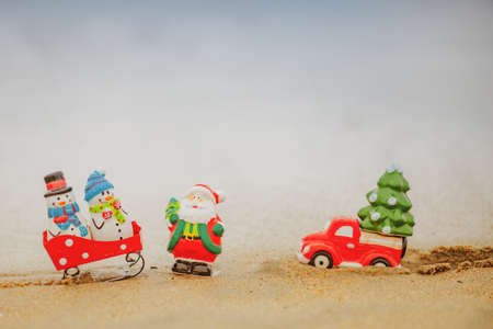 Red retro small car carrying christmas tree on the sea beach shore. Winter holiday concept