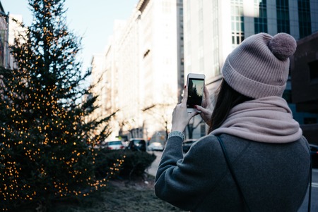 Back view of a young woman taking picture with mobile phone of a city street with pine tree covered in lights