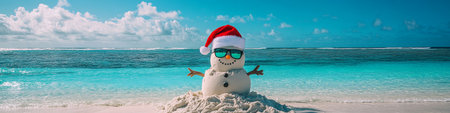 Christmas Snowman on Tropical Vacation Building Sandcastles on a Sunny Beach Paradise
