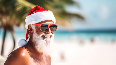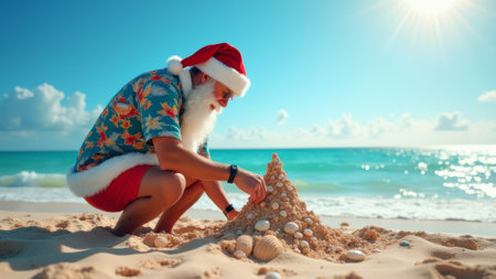 Santa claus building sandcastle on tropical beach under bright sun for summer celebration.