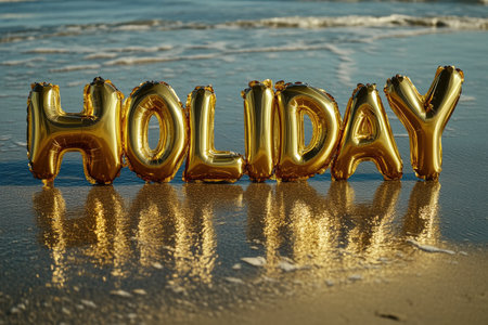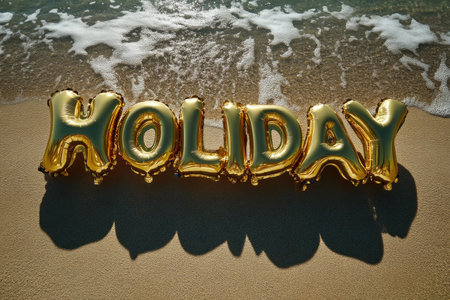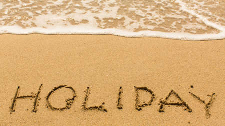 Inscription of word Holiday written on wet yellow beach sand and brown coconut