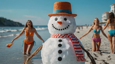 A whimsical snowman made of melting snow stands on a sandy beach during a warm sunset. Dressed with a classic black top hat adorned with festive decorations, it has stick arms, a carrot nose, and coal buttons and eyes. The ocean waves gently lap the shoreline in the background, creating a surreal blend of winter and summer scenery. This image symbolizes a unique and playful juxtaposition of seasons, perfect for capturing the imagination