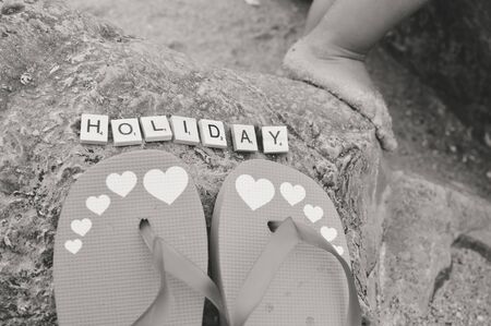 Black and white image of holiday sign, child foot and adult flip flops resting on the beach background, top view flat lay closeup