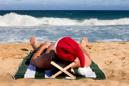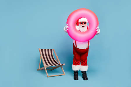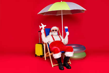 Happy Santa Claus sunbathing on the beach in red santa hat and sunglasses. Creative Xmas and New Year background. Tropical Christmas travels. Christmas and New Year celebration