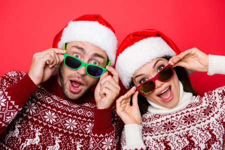 Omg! Increadible unbelievable crazy december discount on trips! Travel time! Holly jolly x mas! Closeup of excited astonished tourists with wide open eyes, mouthes, adjusting eye wear, noel costumes