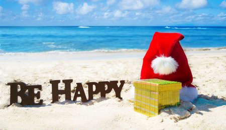 Sign Be Happy with christmas hat and gift box on the sandy beach by the ocean in sunny day