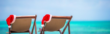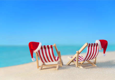 Sun loungers with Santa hat at beautiful tropical beach with white sand and turquoise water