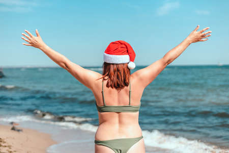 Happy girl in santa hat and swimsuit stands with her back with raised hands up on the seashore