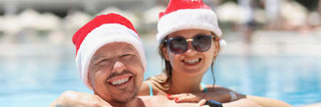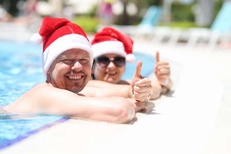 Man and woman in santa claus hats are resting on side of pool and showing thumb up