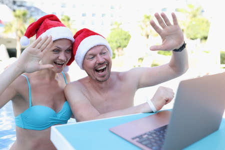 Man and woman in santa claus hats waving hand at laptop screen in pool