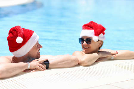Young man and woman in sunglasses and santa claus hats talking in swimming pool