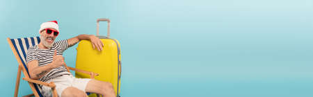 happy mature man in santa hat and sunglasses sitting on deck chair near luggage and showing thumb up on blue, banner