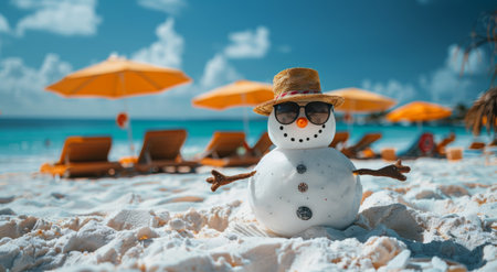 A snowman wearing sunglasses and a straw hat is relaxing on a sunny beach with white sand, turquoise water, and orange umbrellas.