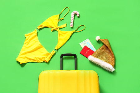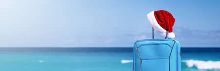 Santa Claus hat on suitcase handle with tropical beach and turquoise sea background. Christmas and New Year celebration. Nobody