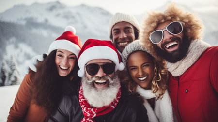 Portrait of a group of friends wearing santa claus hats on the background of snowy mountains
