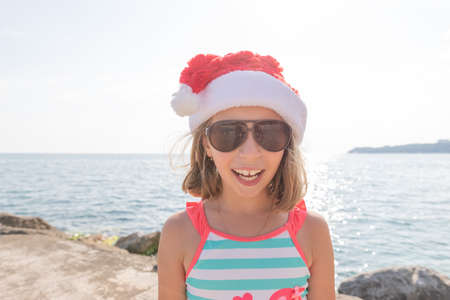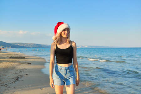Beautiful smiling happy teenage girl in Santa Claus hat walking along the beach. Christmas and New Year holidays, vacations, travel, tourism concept