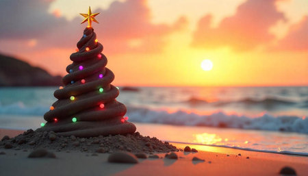 A coastal-inspired Christmas tree with nautical decorations and presents placed beneath it on a pristine beach, with the ocean shimmering nearby.