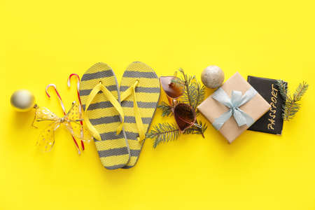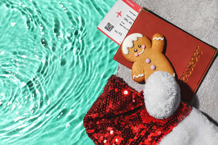 Santa hat with Christmas cookie, passport and ticket near swimming pool