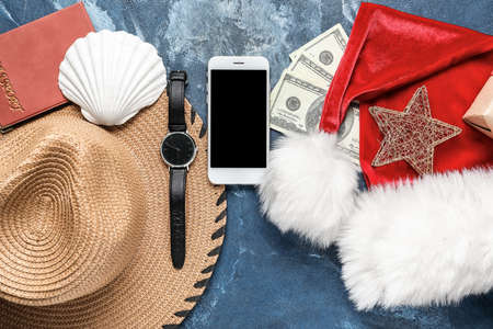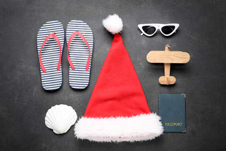 Santa Claus hat and set of things for holidays on wooden background. Christmas travel concept.