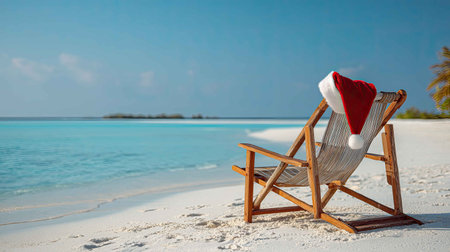 A beach chair adorned with a red Christmas hat sits on soft sands, surrounded by clear turquoise waters and a vibrant blue sky, ideal for a festive escape.