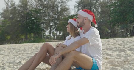 Young romantic couple in red Santa hats sitting on tropical white sand beach