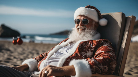 Portrait of happy Santa Claus sitting in lounge chair on the beach. Christmas vacation concept.