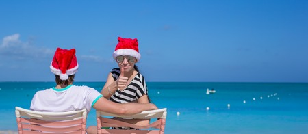 Happy romantic couple in red Santa hats at tropical beach relaxing on sun beds