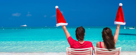 Back view of young couple in Santa hats relaxing on tropical beach during Christmas vacation