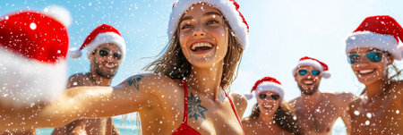 Friends Celebrating Christmas on Tropical Beach, Wearing Santa Hats, Having Fun in Sun.