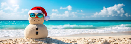 Joyful Summer Christmas at the Beach Festive Snowman with Santa Hat and Sunglasses by the Ocean