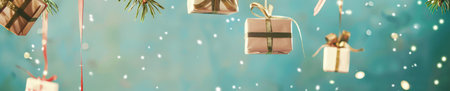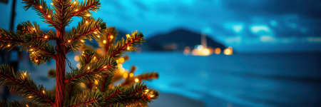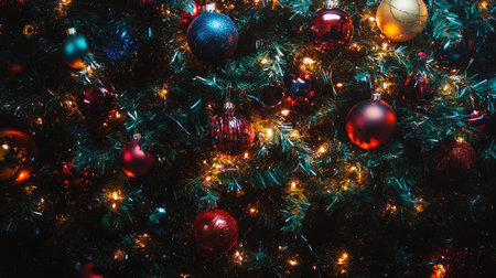 Christmas tree branches holding colorful, shimmering ornaments and glowing string lights, creating a festive holiday decoration background